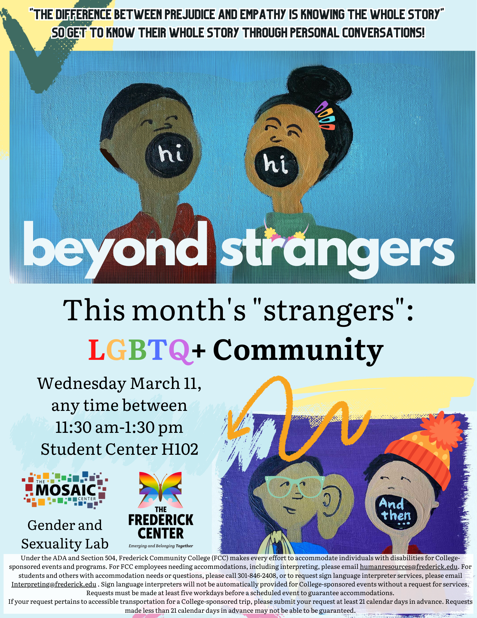 "The difference between prejudice and empathy is knowing the whole story" so get to know the whole story through personal conversations with members of the LGBTQ+ community! From 11:30-1:30pm at FCC's Student Center on March 11th, community members are invited to engage in thoughtful and kind conversations that promote acceptance, understanding, and empathy. We hope to see you there!
