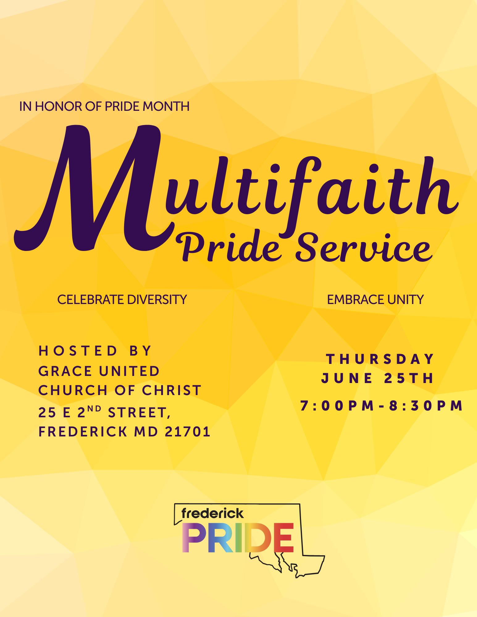 Held at Grace United Church of Christ, folks of all walks of faith are welcome to join us for the Multifaith Pride Service on Thursday, June 25th from 7:00-8:30pm. We hope to see you there!