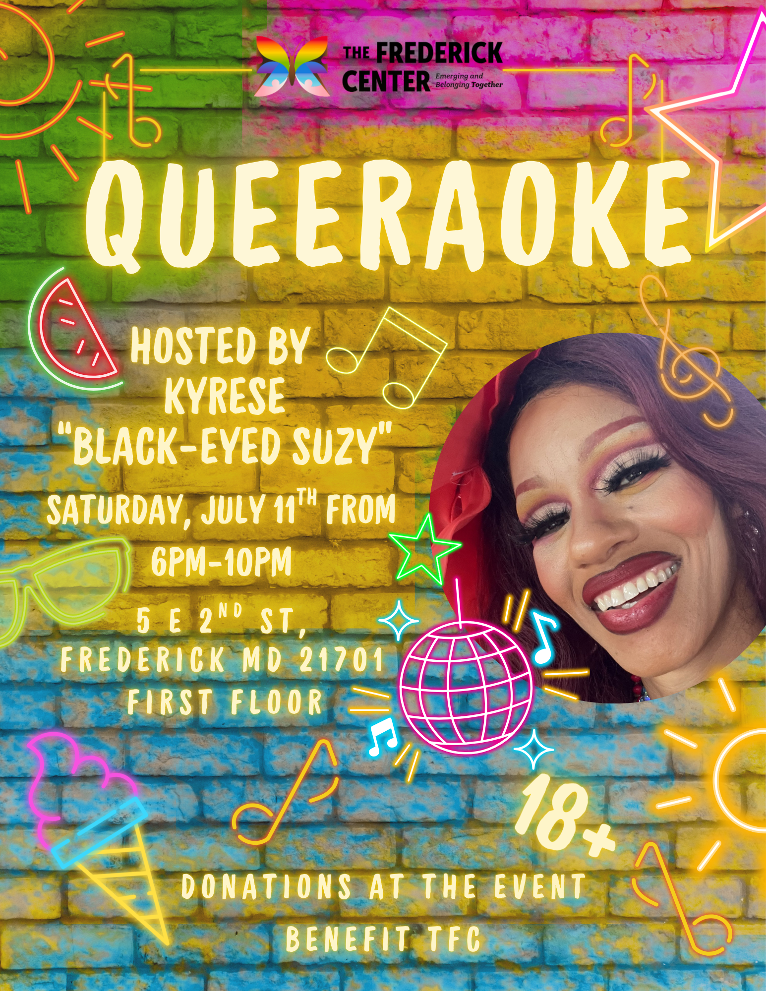 Join us to sing along to your favorite songs on Saturday, July 11th at 6pm at Queeraoke! This event will be hosted by our beloved Black-Eyed Suzy! Queeraoke is for everyone ages 21+, and donations at the event go to benefit TFC. We hope to see you there!