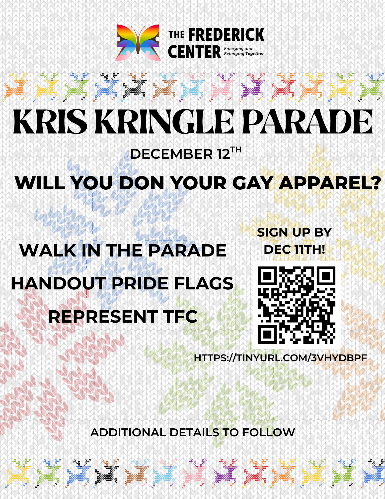 Will you don your gay apparel? Join The Frederick Center in the annual Kris Kringle Parade this year! Register to represent TFC and march along with us!