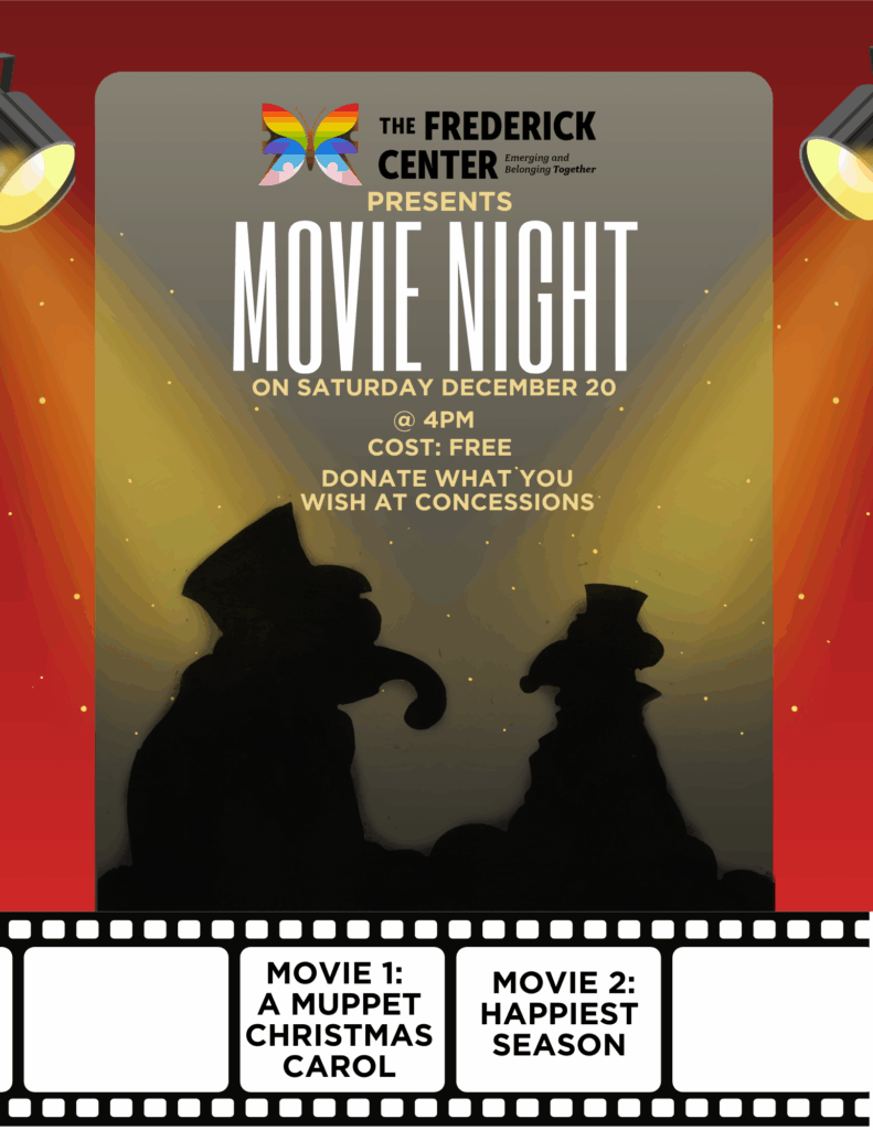 Join us at The Frederick Center for family movie night to celebrate the holidays with chosen family! Starting at 4pm, we will first watch the Muppet Christmas Carroll (rated G), followed by Happiest Season (rated PG-13)! This event is free and open to the public.