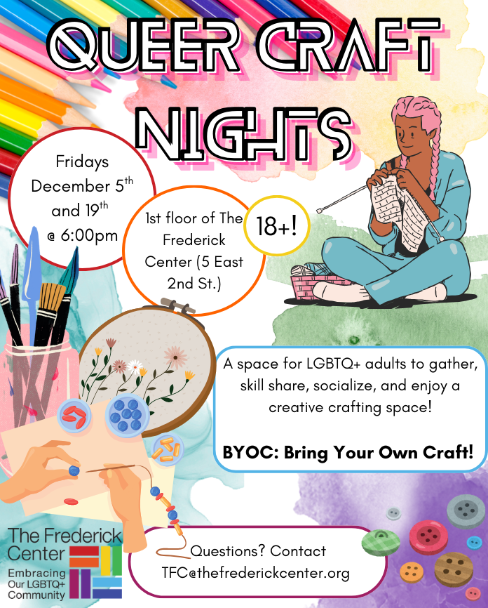 BYOC (Bring Your Own Craft) to The Frederick Center for December Craft Nights! From 6-9pm on Fridays December 5th and 19th, you can join fellow LGBTQ+ community members for a safe and affirming place to meet new friends, learn new crafts, or craft quietly on your own with friends!