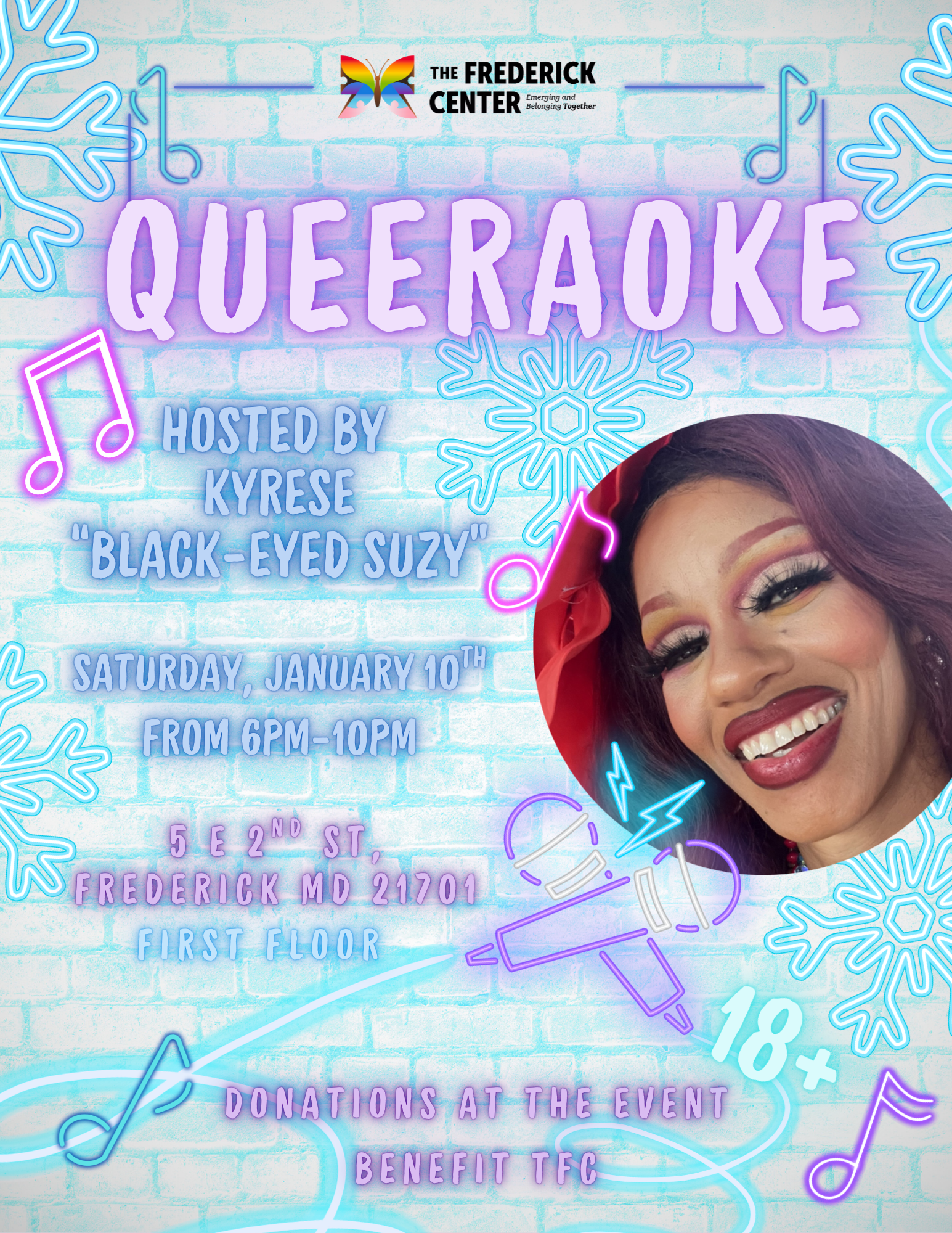 Join us at TFC on Saturday, January 10th from 6:00pm onwards to sing and dance along with our amazing drag talent host, Black-Eyed Suzy! This event is free and open to anyone 18+. We hope to see you there!